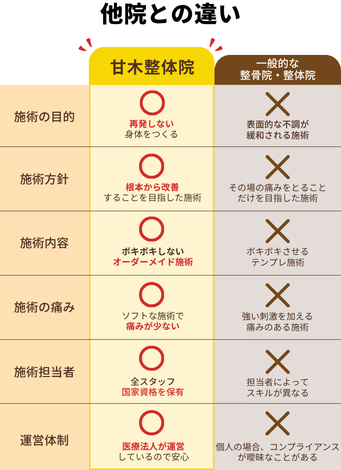 甘木整体院では、一時的な痛みのほぐしではなく、痛みを根本から改善することを重視しています。