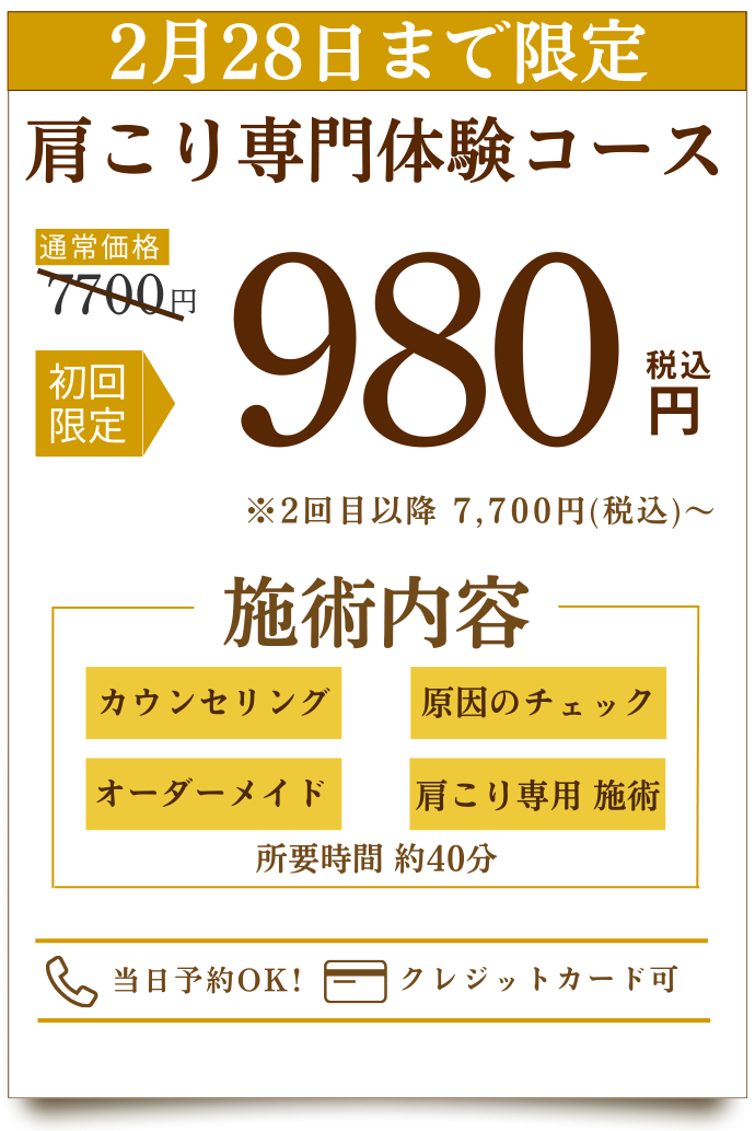 マッサージの効果と施術法マッサージは肩こりの解消に非常に効果的です。特に、肩や首の筋肉を丁寧にほぐすことで、血行が改善し、肩こりが緩和されます。当院では、経験豊富な施術者が、お客様一人ひとりの症状に合わせたマッサージを提供しています。また、家庭でも簡単にできるセルフマッサージの方法も指導していますので、ご自身でも肩こりのケアが可能です。肩こりがひどい場合は、ぜひプロの施術を受けにいらしてください。