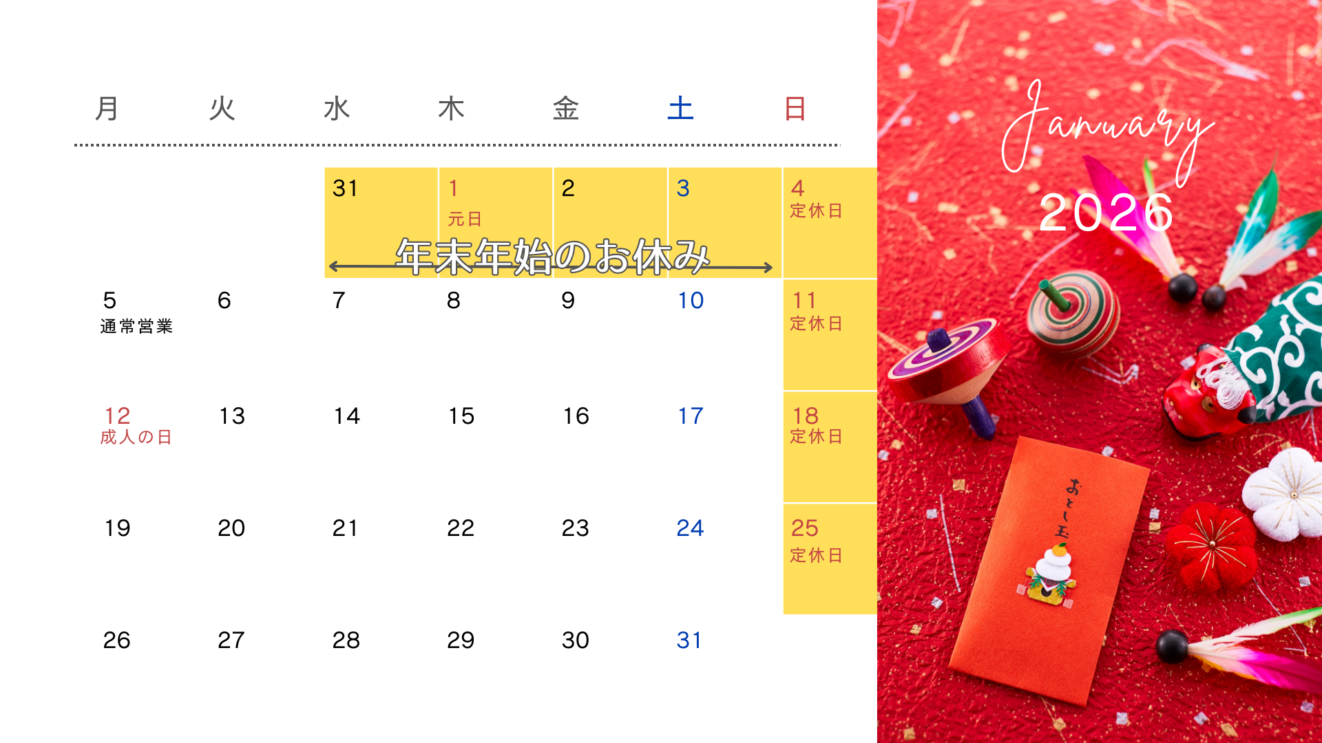 なお2026年は1/5(月)9:00より通常営業いたします。